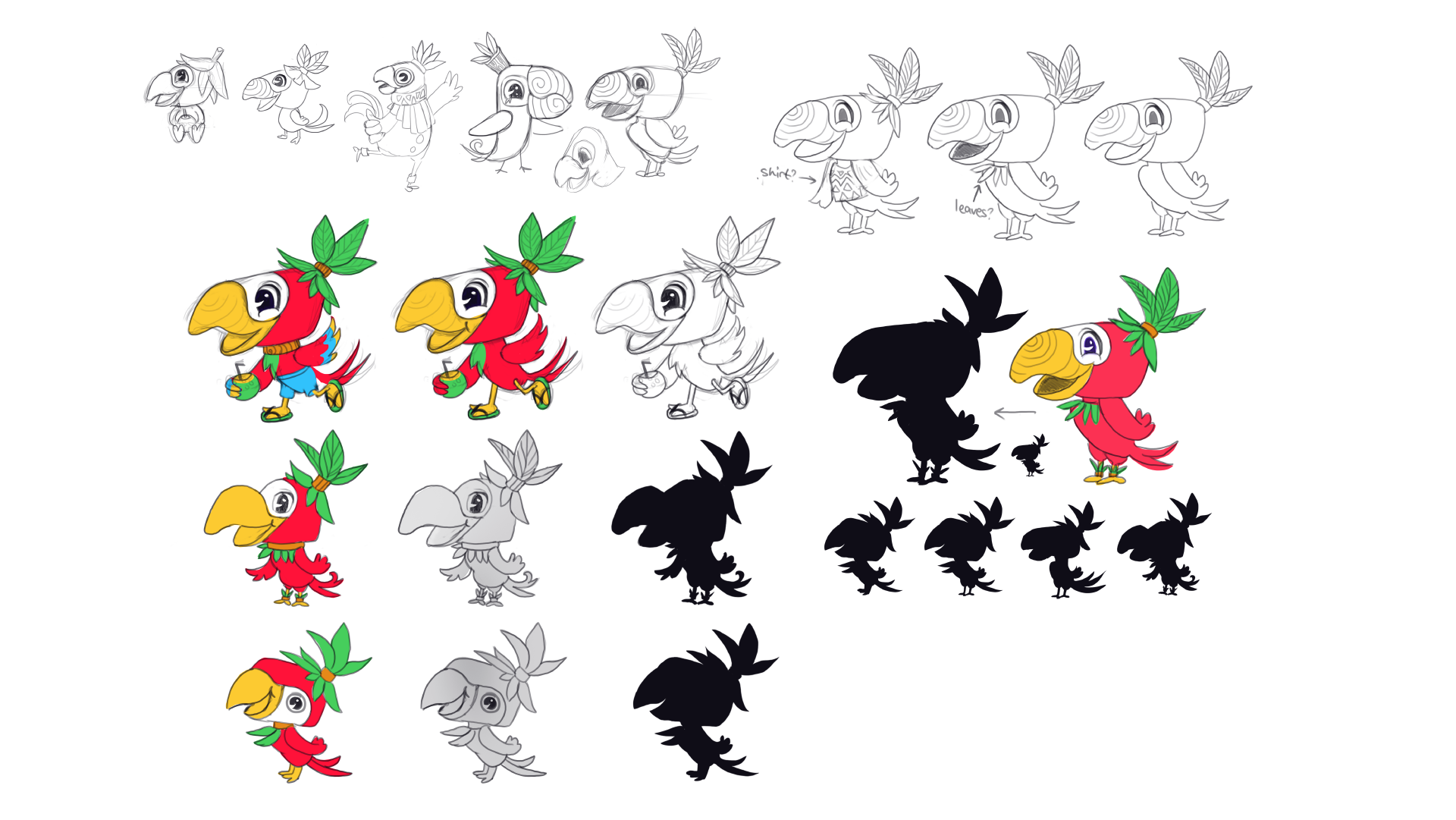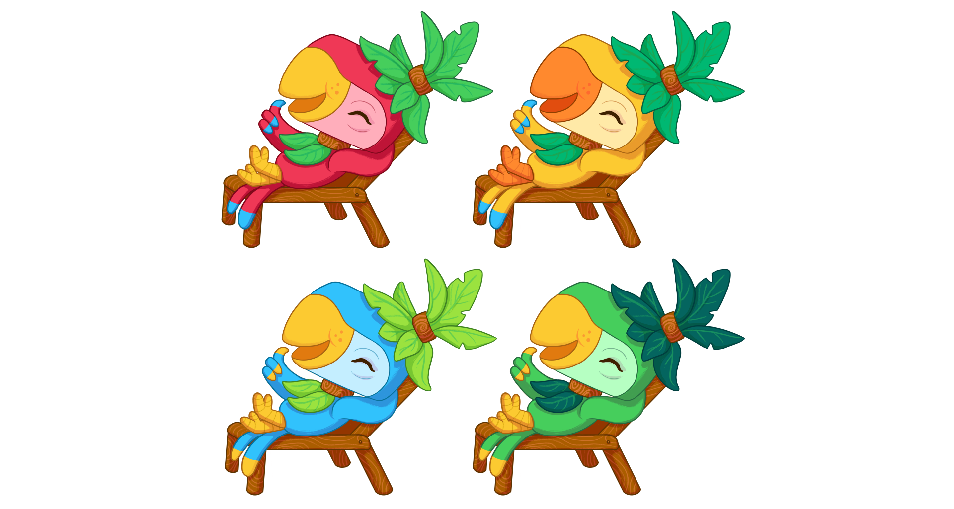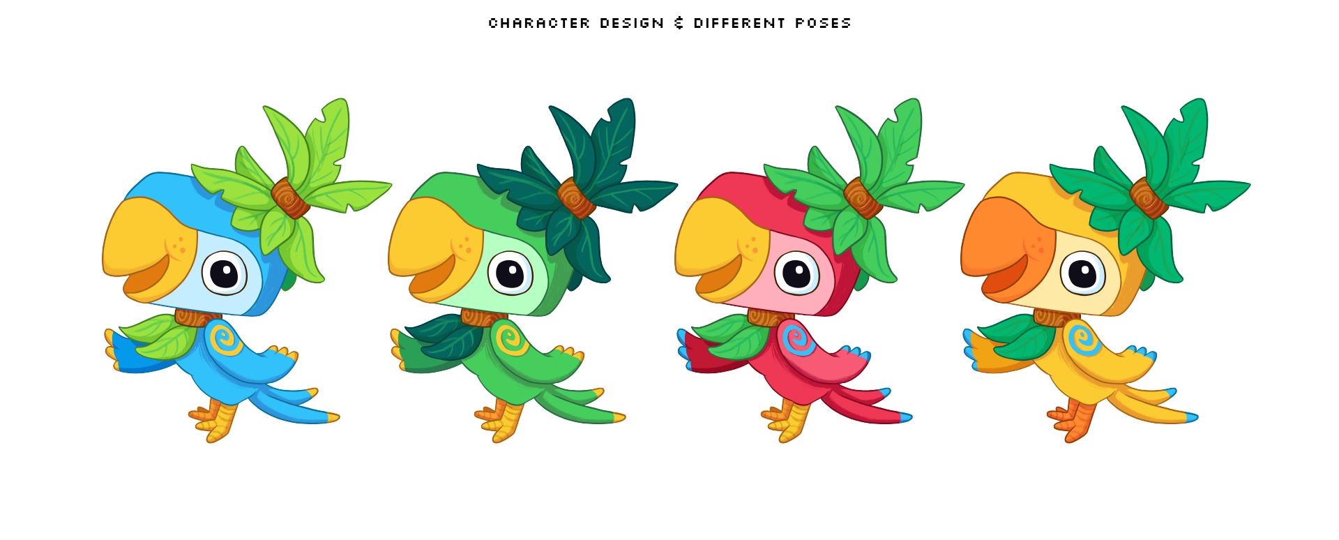 Branding design of a tropical drink for children. The character's name is Tiki the parrot and it lives in a tropical area that incorporates tribal elements and bright colors.