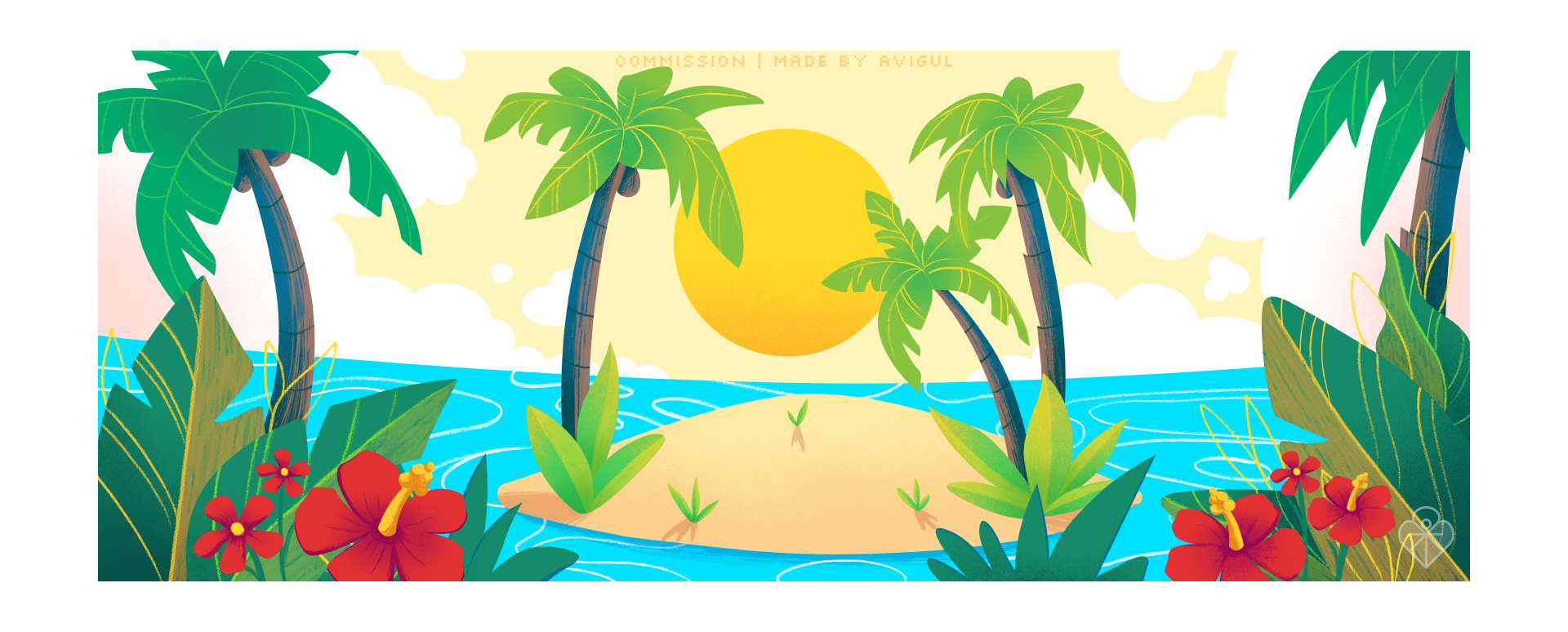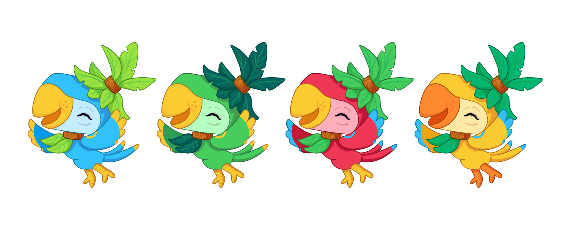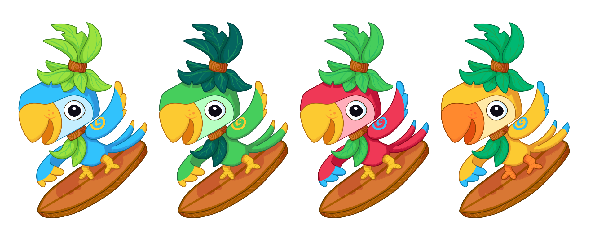 Branding design of a tropical drink for children. The character's name is Tiki the parrot and it lives in a tropical area that incorporates tribal elements and bright colors.
